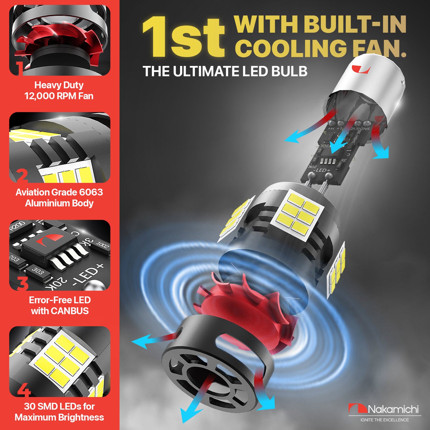 ✅ 50,000 hours of lifespan with state-of-the-art cooling mechanism: Introducing the first-of-its-kind built-in 12,000 RPM fan to draw excess heat from the LED bulb, a heavy-duty cold-forged heat sink, a complete aviation-grade 6063 aluminium body, and a hollow-body design, Nakamichi LED bulbs deliver uninterrupted lighting for over 50,000 hours. Each LED bulb and its components undergo rigorous testing to ensure long-lasting performance. This exceptional build ensures reliable operation even on hot sunny days or in adverse weather conditions.