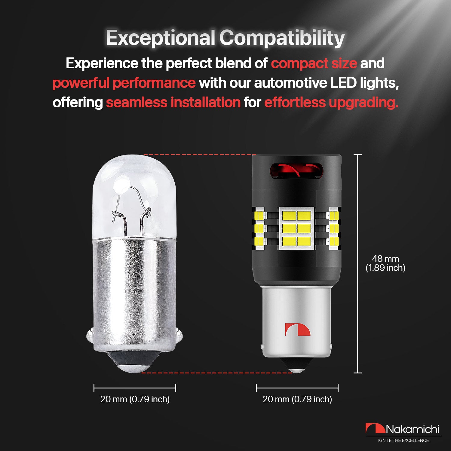 ✅ 1:1 Beam pattern and 360-degree illumination for effective lighting: Nakamichi LED light bulb quality extends beyond mere brightness. It's about having the right construction and LED chips that closely emulate the characteristics and fit of halogen bulbs. These LED bulbs can be used for car turn signal lights, backup/reverse lights, brake lights, parking/position lights and many more. Please check the original bulb size before making your purchase.