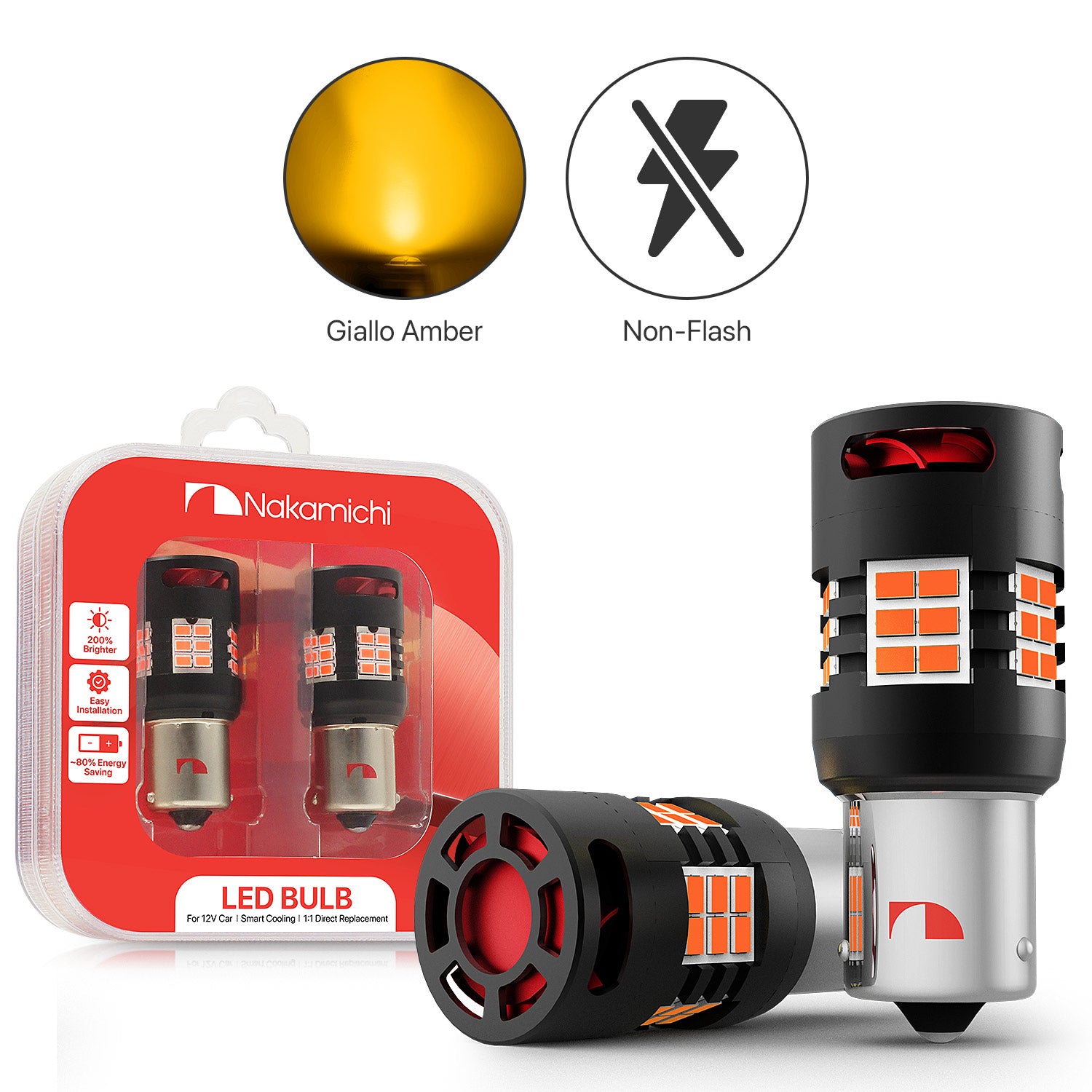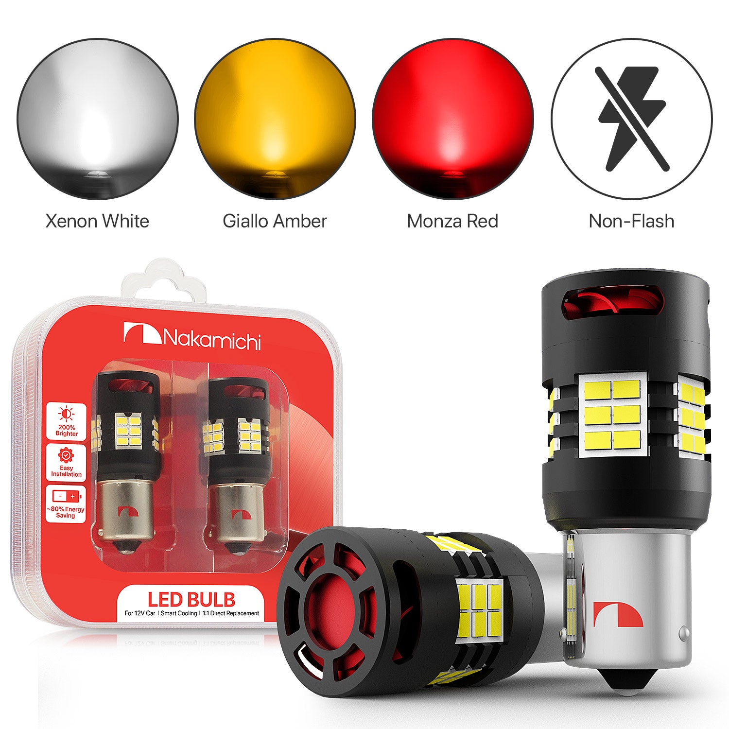 ✅ Achieve 200% more illumination than halogen: Experience a remarkable luminosity of up to 3,000 lumens and 4.5W per bulb with Nakamichi's enhanced 7507 (PY21W, BAU15S — 150° offset pins) LED bulbs. Equipped with 30 high-performance SMD chips per bulb, they generate a brilliant, vivid light that pierces through darkness and bad weather. These bulbs ensure your light indicators are instantly visible to other drivers, enhancing safety in all conditions. Also, with instant start-up, they achieve full brightness without any delay and looks cool indeed.