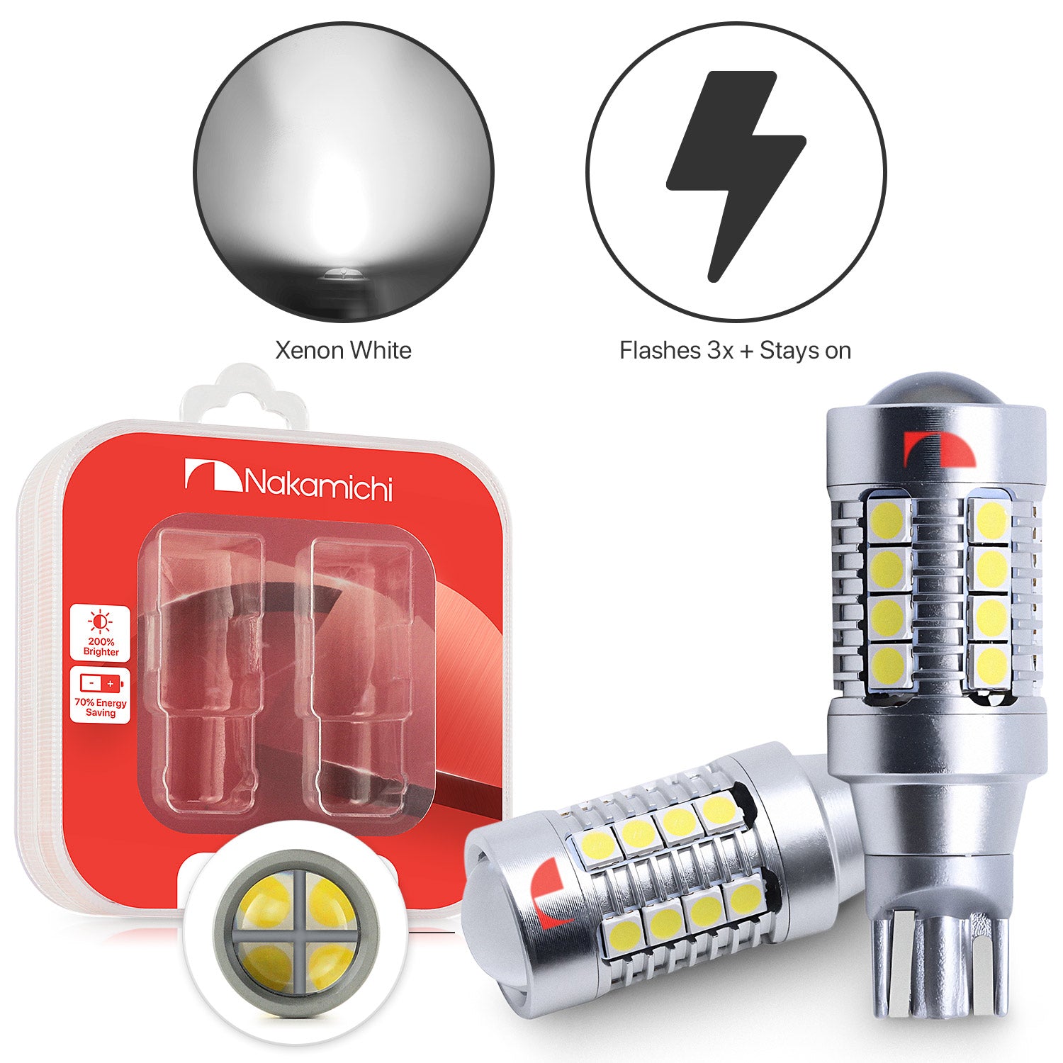 ✅ Achieve 200% more illumination than halogen: Experience a remarkable luminosity of up to 3,920 lumens and 5.6W per bulb with Nakamichi's enhanced T15 (W16W) LED bulbs. Sporting a 6,000K White colour temperature and boasting 28 high-performance SMD chips per bulb, they generate a brilliant vivid xenon white light, dramatically enhancing your nighttime visibility. Allowing you to view objects clearer during nighttime journeys. Also, with instant start-up, they achieve full brightness without any delay and looks cool indeed.